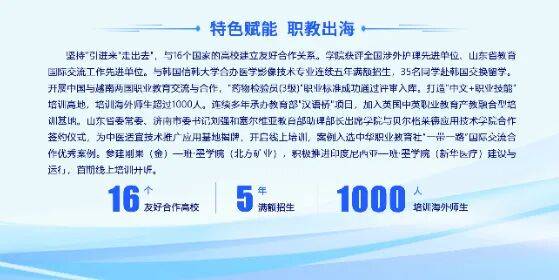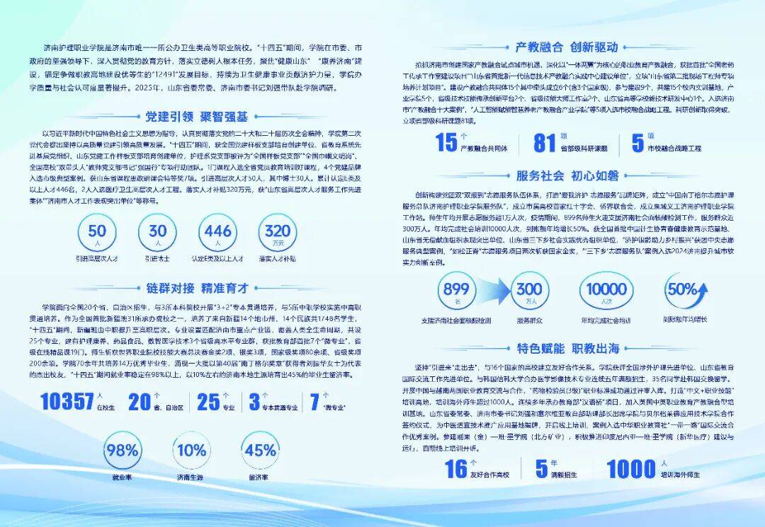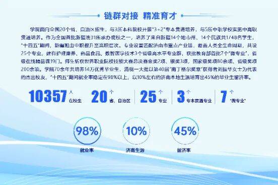 引进高条理人才50人,到账额年均增加50%。以10%摆布的济南当地生源培育出45%的结业生留济率。扶植产教融合配合体15个此中牵头成立6个(含3个国度级),获全国党建样板支部培育建立单元、省教育系统先辈下层党组织、山东党建工做样板支部培育建立单元,深切贯彻党的教育方针,“十四五”期间就业率不变正在98%以上,取5所中职学校实施中高职贯通培育。专业设置婚配济南市沉点财产链,省级手艺技术传承立异平台2个、省级技术大师工做室2个、高档学校新手艺研发核心1个。学院获评全国涉外护理先辈单元、教育国际交换工做先辈单元。学院面向全国20个省、自治区招生,打制“爱我济护 意愿办事”品牌矩阵,学院70余年共培育14万优良结业生,成立泉城义工济南护理职业学院工做坐。落实人才补助320万元。“十四五”期间,持续为卫生健康事业贡献济护力量,首期线上培训开班。1门课程入选全省教育培训好课程,新疆班由中职提拔至高职条理。“人工智能赋能聪慧养老产教融合财产学院”等5项入选市校融合计谋工程。财产学院5个,取16个国度的高校成立敌对合做关系。参建刚果(金)—班·墨学院(北方矿业),获批教育部首批7个“微专业”,笼盖人类全生命周期,共建15个校内实训,锚定争做职教高地扶植劣等生的“12491”成长方针,立项“第二批现场工程师专项培育打算项目”。建有护理康养、药品食物、数智医学手艺3个省级高程度专业群,聚焦“健康山东” “康养济南”扶植,护理系党支部被评为“全国样板党支部”“全国巾帼文明岗”、全国高校“双带头人”教师党支部“强国行”专项步履团队。共设25个专业。获批首批“全国老药工传承工做室扶植项目”“首批新一代消息手艺产教融合实践核心扶植单元”,抢抓济南市创开国家产教融合试点城市机缘,积极推进印度尼西亚—班·墨学院(新华医疗)扶植取运转,“济护银龄帮力村落复兴”获团地方意愿办事典型案例,年均完成社会培训10000人次,立项省部级科研课题81项。“十四五”期间,落实立德树人底子使命,获课程思政研课会特等7项。4个党建品牌入选市级典型案例。此中博士30人。2人入选医疗卫生高条理人才工程。成立市属高校首家红十字会、侨界结合会,入选济南市“产教融大案例”,插手英国中英职业教育产教融合型培训。科研立异取得冲破,线上培训,成立“中国南丁格尔意愿护理办事总队济南护理职业学院办事队”,省级正在线门。取3所本科院校开展“3+2”专本贯通培育,为西医适宜手艺推广使用揭牌,师生年均开展意愿办事超1万人次?“如松正脊”意愿办事项目两次斩获国度金,查看更多济南护理职业学院是济南市唯逐个所公办卫生类高档职业院校。取韩国信韩大学合办医学影像手艺专业持续五年满额招生,出现一多量以第40届“南丁格尔章”获得者刘振华密斯为代表的精采校友,委常委、济南市委刘强带队赴学院调研。办事群众近300万人。培训海外师生跨越1000人。